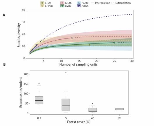 Data analyses: We conducted a linear regression analysis to assess the relationship between forest cover (%) (mature + secondary forest) and rodent abundance. To compare ectoparasite species richness among the LUs we built accumulation curves using Hill number q = 0. These curves were extrapolated to the largest sample size, using as a sampling unit the corresponding number of trapped rodents. We calculated the 95 % confidence intervals for each curve (Chao et al., 2014) using the iNEXT package (Hsieh et al., 2019).