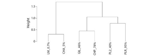 The dendrogram using the UPGMA algorithm had the highest cophenetic correlation (0.846 vs. 0.840, 0.830, 0.782) and the lowest Gower distance (0.401 vs. 1.036, 1.390, 3.037). Sites were segregated into two main clusters. The first one of them was constituted by the sites with the lowest forest coverage. The second main cluster was, in turn, divided into two smaller clusters. The first one of these sub-clusters included sites GIL_46 % and CHP_78 %, which had a relatively high species richness of ectoparasites whereas the second included sites PL2_40 % and PLR_95 % (Fig. 4).