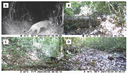 Central American Agoutis and Lowland Pacas are common rodents in fragmented landscapes. These animals are considered important seed predators and dispersers. Agoutis are primarily diurnal and are commonly found in human altered landscapes, including agroforestry systems such as coffee plantations (Sánchez-Brenes & Monge, 2021), which is a common land use at the studied site. Pacas are nocturnal animals which are considered vulnerable in Costa Rica, due to heavy hunting pressure, which although illegal, is a common practice in the study site. The high number of detections of these species, while not necessarily related to their abundance, is a good indicator of prey availability for predators such as coyotes, ocelots and pumas (Emsens et al., 2014).