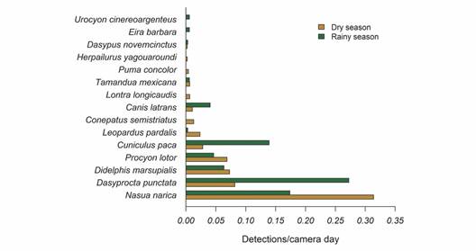 The presence of rare species was the main difference between wet and dry seasons. The Striped Hog-nosed Skunk, the Puma, the Neotropical River Otter, and the Jaguarundi were only observed during the dry season.