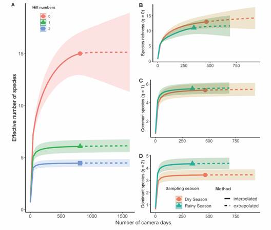 We characterized mammal's species diversity by applying rarefaction and extrapolation curves using Hill numbers for sample-based incidence (Chao et al., 2014; Hsieh et al., 2016). We used species detectability (number of detections per species per camera trap day) as the relative incidence when performing the rarefaction/extrapolation curves. Hill numbers represent the effective number of species within a community (Jost, 2006). The first Hill number (q0) is equivalent to species richness. The second one (q1) corresponds to the effective number of equally common species. The third one (q2) includes detectability as well, but it prioritizes the species with the higher frequency of detections (Chao et al., 2014; Hsieh et al., 2016).