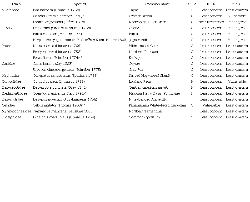 Results: We detected 19 species of mammals. The most frequently detected species were the White-nosed Coati (Nasua narica; 0.254 detections/camera trap day), and the Central American Agouti (Dasyprocta punctata; 0.163 detections/camera trap day). We also registered four species considered as endangered in Costa Rica, three felines: Puma concolor, Herpailurus yagouaroundi, Leopardus pardalis, and the Neotropical River Otter, Lontra longicaudis. Seasonality did not affect species diversity, but it influenced dominant species and detectability, which was greater during the wet season.