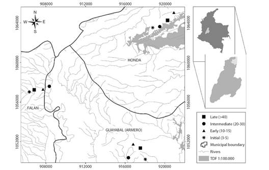 A total of 12 permanent monitoring plots (PMP) were established (three plots in each successional stage). Since age is not a precise succession metric (Chazdon, 2014), we assigned an approximate age from forest/no forest thematic layers corresponding to 1990, 2000, 2005, 2010 and 2013 years (Salgado-Negret et al., 2017). Additionally, we consider local communities' knowledge regarding age abandonment, in this way age ranges were defined for each successional stage: initial (3-5 years); early (10-15 years); intermediate (20-30); and late (> 40 years). Initial corresponds to sites that have lost their original coverage, which historically were agricultural crops and pastures that were abandoned in the last 5 years. Early characterized by an open canopy, with arboreal and shrubby elements that originated from plant succession in the last 10 to 15 years. Intermediate forests were distinguished by regularly distributed tree elements, forming a discontinuous canopy with trees that reach heights of up to 25 m, tree cover between 30-70 % and an age of abandonment greater than 20 years. Finally, late forests constitute little intervening vegetal formations (sporadic presence of cattle), which are characterized by high natural regeneration, closed canopy and differentiated strata with coverage greater than 70 % (Table 1).