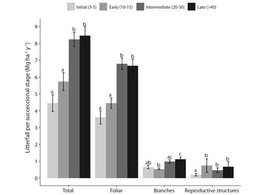 Litterfall recorded in this study (4.45-8.46 Mg ha-1 y-1) was within the range reported in similar forest ecosystems (Aryal et al., 2015; González-Rodríguez et al., 2011). In this regard, litterfall was low in initial and early stages and increased in intermediate and late forests, due to the recovery of the structure and species richness. In general, these results support our first hypothesis and coincided with several studies in TDFs in Mexico (Morffi-Mestre et al., 2020; Sánchez-Silva et al., 2018), Costa Rica (Schilling et al., 2016) and Brazil (Souza et al., 2019), who's attributed litterfall increase to the biomass superiority and canopy development.