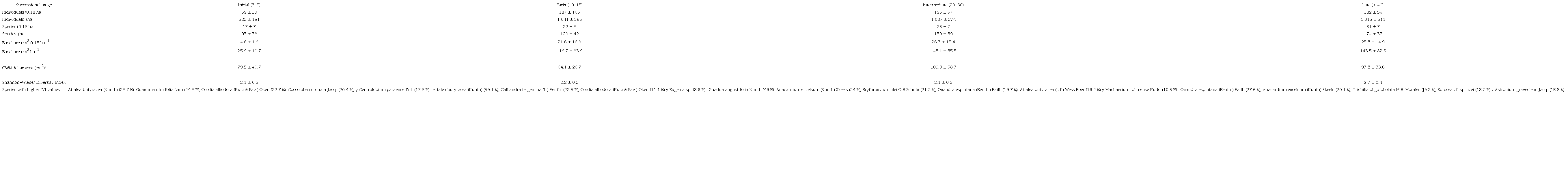 Centrolobium paraense, Albizia guachapele and Guazuma ulmifolia were the ones species that contributed the most to leaf litter in initial (41.03 %). Calliandra tergemina, Spondias mombin and Attalea butyracea represented the greatest contribution in early (29.85 %). For its part, Guadua angustifolia, Trichilia oligofoliolata and Anacardium excelsum represented 49.16 % of the leaf litter in intermediate, while A. excelsum, T. oligofoliolata and Oxandra espintiana constituted 33.45 % in late forests (Table 2).