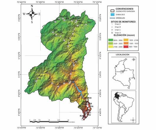 Área de estudio: La cuenca del río Garagoa se ubica en el margen oriental de la cordillera oriental de Colombia y pertenece a la zona hidrográfica del río Meta dentro de la macrocuenca del río Orinoco. Este ecosistema lótico nace en el páramo de Rabanal en el municipio de Samacá a una altura de 3 450 m.s.n.m. y desemboca en el río Guavio a una altura de 500 m.s.n.m. Tiene una superficie aproximada de 250 000 ha, donde el 80 % pertenece al departamento de Boyacá y el 20 % a Cundinamarca. La temperatura promedio de la cuenca varía entre 13.4 °C, en la parte alta, y 18.8 °C, en la parte baja; la precipitación presenta un régimen monomodal en gran parte de la cuenca, con precipitaciones máximas en junio (hasta 600 mm/mes) y mínimas de diciembre a febrero (< 100 mm/mes) (Corpochivor, 2018).