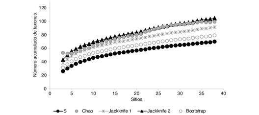 El estimador Jackknife2 indicó la riqueza más alta con 104.9 taxones y sin ninguna variación en los datos, mientras que Chao2 mostró una riqueza de 99.4 taxones, pero con una desviación estándar de ± 17.2. Respecto a la riqueza reportada por sitio de muestreo, se evidenció que los sitios con mayor número de taxones fueron R08 y R09, ubicados dentro de las subcuencas Teatinos y Juyasia, con un orden limnológico 5 (Tabla 1). En segundo lugar, estuvieron los sitios R10, R20 y R21 dentro de las subcuencas Tibaná y Garagoa con un orden limnológico 6. En contraste, los sitios con la menor riqueza fueron R39, R37 y R31 ubicados en la subcuenca Batá con un orden limnológico 7 (Tabla 1).