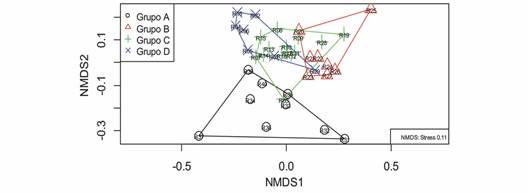 A nivel de familia, el análisis NMDS evidencia una mayor agrupación entre los grupos altitudinales evaluados (Fig. 4). Se evidencia que los sitios con menor altitud (grupo A) presentaron un comportamiento similar al observado en el NMDS a nivel de género, pues fue el grupo más disperso respecto a los demás. Por otra parte, los grupos B y C con un gradiente altitudinal entre 1 100 a 2 300 m.s.n.m. presentaron una mayor agrupación, y los sitios del grupo D (2 300 a 2 900 m.s.n.m.) se agruparon en mayor medida con los sitios del grupo C (1 732 a 2 300 m.s.n.m.). Para este análisis las estadísticas de correlación indicaron el ajuste entre las distancias de ordenación y las diferencias observadas (R2 = 0.99) y un nivel de estrés de 0.10 para una adecuada interpretación del NMDS. La prueba PERMANOVA en este nivel taxonómico también evidencian las diferencias entre los grupos altitudinales evaluados respecto a la composición de la comunidad (R2 = 0.312; P = 0.001). La prueba Pairwise a nivel de familia indica que existen diferencias significativas entre todos los grupos de sitios (P < 0.05). Se destaca el grupo A por presentar los valores de significancia más bajos de la prueba Pairwise y diferir en mayor medida respecto a los demás grupos (P = 0.006). Los resultados del análisis SIMPER mostraron que las familias que contribuyeron en mayor medida a la disimilitud fueron Limoniidae (72 %) y Psychodidae (70 %) para los grupos D y C, Chironomidae (70 %) y Simuliidae (68 %) para los grupos D y B, Corydalidae (72 %) y Chironomidae (69 %) para los grupos D y A, Chironomidae (72 %) y Leptoceridae (69 %) para los grupos C y B, Veliidae (72 %) y Sphaeriidae (69 %) para los grupos C y A, Perlidae (73 %) y Helicopsychidae (70 %) para los grupos B y A.