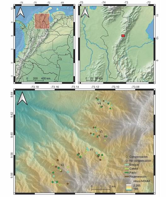 Este estudio se llevó a cabo en cuatro localidades rurales de la Serranía del Perijá, en el departamento del Cesar (Fig. 1). Las localidades estudiadas presentan elevaciones entre los 800 y 1 600 m.s.n.m., con temperatura promedio entre 19 y 24.3 °C; la vegetación predominante corresponde a bosque seco tropical y bosque subhúmedo tropical. El promedio de precipitaciones anuales oscila entre 1 000 y 2 000 mm (Aguilera, 2016).