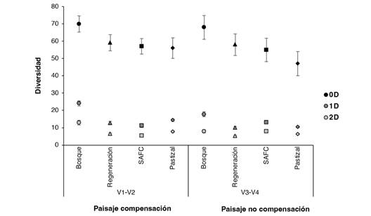 Riqueza y diversidad entre usos de suelo y paisajes estudiados: V1 fue la localidad con mayor riqueza de especies, mientras que V2 fue la localidad con menor riqueza, ambas dentro del paisaje de compensación. El análisis de diversidad mostró que los bosques en los dos paisajes estudiados fueron el uso de suelo con mayor riqueza (0D) y diversidad (1D) de especies, mientras que los pastizales presentaron menor riqueza (Fig. 3).