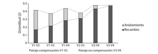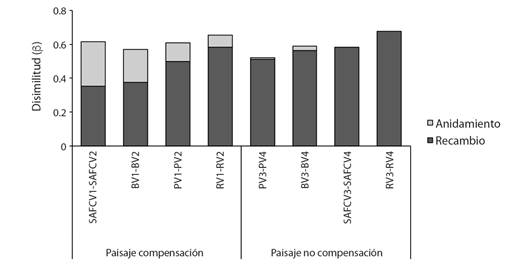 Además, entre las localidades del paisaje de no compensación (V3-V4), se evidenció que el componente de recambio (0.46) fue mayor que el anidamiento (Fig. 4). Es decir que estas localidades difieren ampliamente en la composición de especies. El recambio o ganancia de especies fue total entre las áreas de regeneración y los SAFC de estas localidades (Fig. 5).