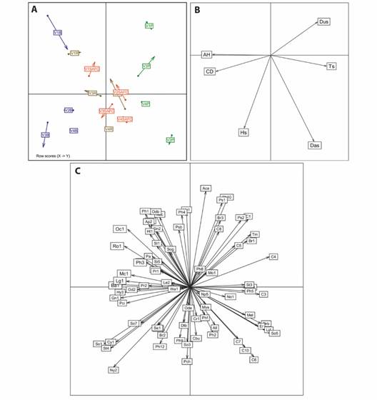 Para evaluar la asociación entre los parámetros ambientales y biológicos, se empleó el análisis de correlación multivariable de Co-inercia. Para las variables biológicas se consideraron taxones frecuentes (presentes más de una vez) y con frecuencias de captura superiores a uno. Este análisis se realizó utilizando el paquete ade4 para R (Bougeard & Dray, 2018). Posteriormente, el análisis de Co-inercia fue validado por el test de permutaciones de Monte-Carlo.