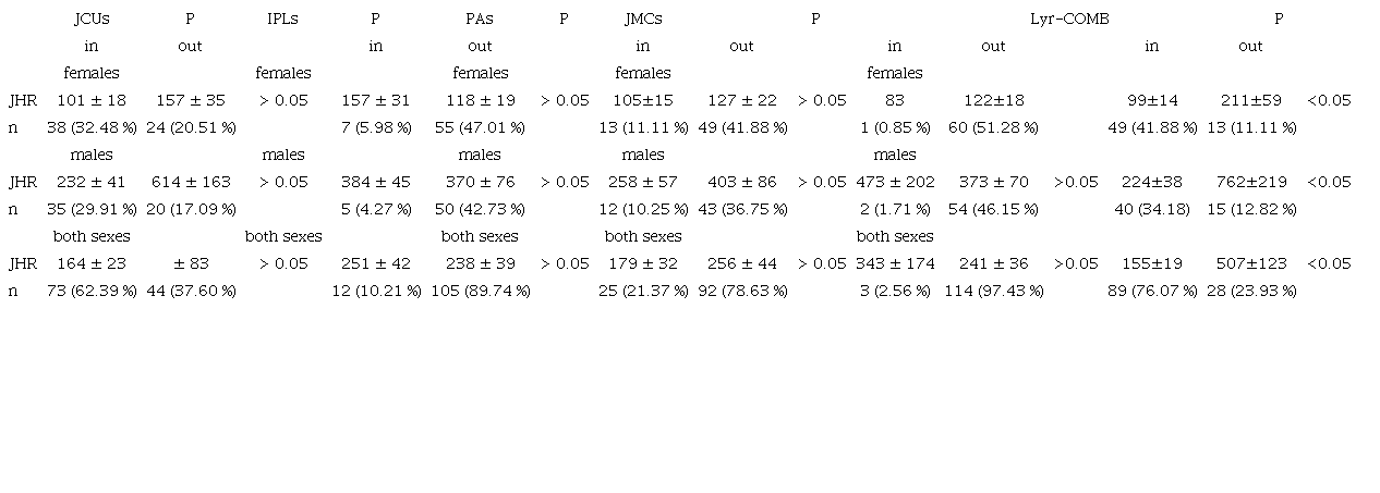 Seventy-three of 117 (62.4 %; 38 females: 35 males) JHR occurred in some part of JCUs, where females and males JHR ranged from 101 ± 18 to 232 ± 41 km2, respectively. While 44 of 117 (37.6 %; 24 females: 20 males) individual home ranges occurred outside the designated boundaries of JCUs, where the sizes of JHR ranging from 157 ± 35 to 614 ± 163 km2 for males and females, respectively, but jaguar home-ranges do not show significant differences (P > 0.05) between inside and outside of JCUs (Table 1).