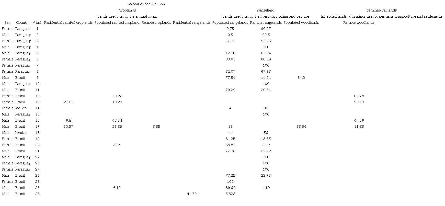 Next, we evaluated how each jaguar's home range overlapped with the different habitat protection categories and land uses, previously described. For each jaguar home-ranges (JHR) in our dataset, we calculate the percentage of the home range overlap where it occurred for each individual with every selected land category. In those cases where > 90 % of the KDE home range was occupied by a single landscape category (i.e., JCUs, JMCs, PAs, IPLs or Lyr-COMB) only that spatial category was considered. Then, when KDE jaguar home-ranges did not overlap with any formal conservation land or habitat protection categories, we identified the main human biomes (i.e., croplands, rangeland or seminatural lands) overlapping totally within each home range.