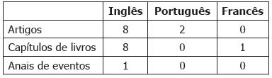 Esses parâmetros nos levaram a artigos científicos, anais de congressos e capítulos de livro, a partir dos quais realizamos uma leitura seletiva (Lima e Mioto, 2007). A seleção de produções foi efetuada segundo a definição ou a visão de mobile learning promovidas e em função das tecnologias abordadas. Excluímos, por exemplo, trabalhos focados no uso do notebook. A Tabela 1 apresenta as 20 fontes do corpus final, por tipo de produção e língua de divulgação. Observa-se que o inglês foi predominante, o que se explica pela dimensão internacional da área, representada em congressos, livros e revistas dedicadas (Endrizzi, 2011), bem como pelos parâmetros linguísticos que definimos. De forma geral, as produções lusófonas e francófonas divulgavam os trabalhos anglo-saxões.