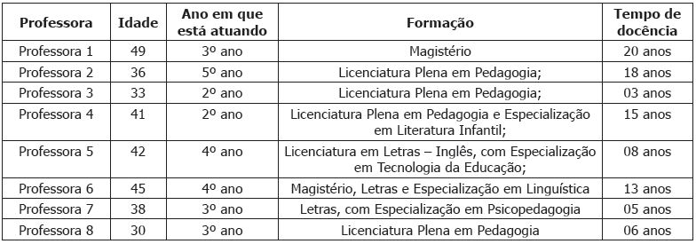 A segunda fase da pesquisa consistiu da análise de entrevistas. Participaram oito professoras da Rede municipal de ensino de Camaragibe - PE que lecionavam em cinco escolas da mesma rede e possuíam os perfis mostrados na Tabela 1.