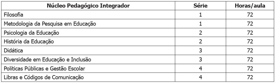 Para contribuir com o desenvolvimento desse perfil foi criado o Núcleo Pedagógico Integrador - NPI, que consiste das disciplinas pedagógicas e de formação geral, apresentadas no Quadro 1.
