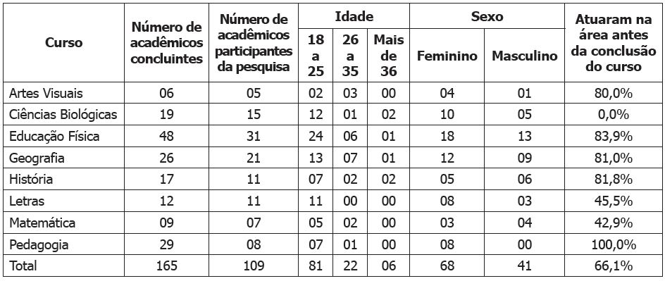 Dos 165 acadêmicos das séries finais dos cursos de licenciatura, no momento da aplicação do questionário, 109 responderam à pesquisa. Os dados dos participantes encontram-se na Tabela 1.