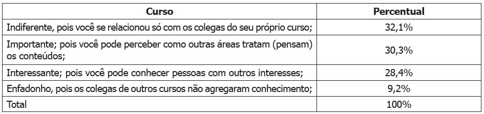 Para compreender como os acadêmicos perceberam a oportunidade de cursar disciplinas com colegas de outros cursos, foi incluída no questionário uma questão fechada, com as opções Importante, Interessante, Indiferente e Enfadonho, devidamente caracterizadas, conforme demonstrado na Tabela 3, que apresenta as respostas obtidas.