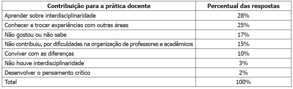 Com relação à percepção dos acadêmicos sobre como a integração com colegas de outros cursos, oportunizada pelas disciplinas do NPI, contribuiu para a sua futura prática docente, foi elaborada uma questão aberta, cujas respostas foram organizadas em grupos semânticos, conforme a Tabela 4.