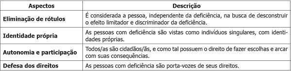Considerei, assim, que os conceitos de empoderamento e autoadvocacia, neste estudo, estão estritamente relacionados ao modelo social de deficiência adotado pela Convenção sobre os Direitos das Pessoas com Deficiência (ONU, 2006). Neles, as pessoas com deficiência são vistas como pessoas que vivem em contextos sociais e, portanto, são sujeitos de direitos.
