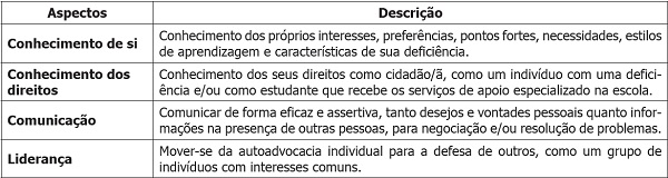 Na literatura internacional, pesquisadores (Test et al., 2005) também apontam elementos que caracterizam a autoadvocacia e, apesar de serem nominalmente distintos dos elementos apresentados pela autora brasileira, assemelham-se na sua filosofia e essência, como mostra o Quadro 2.
