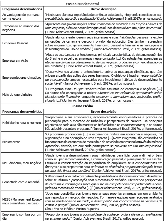 O desenvolvimento de competências empreendedoras nos contextos escolares encontra respaldo neste conjunto de pressupostos. Os programas da Junior versam sobre o desenvolvimento de competências empreendedoras nos seus três níveis: empregabilidade, desenvolvimento de um conjunto de atributos dos sujeitos empreendedores - o que já justificaria os investimentos feitos no nível do indivíduo - e empreendedorismo social/sustentabilidade, conforme pode ser evidenciado no Quadro 1.