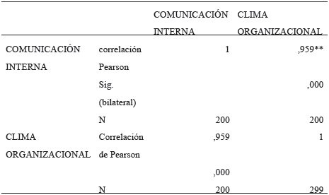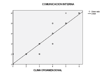 En el gráfico 1, y la tabla 2 se muestra la existencia de una correlación significativa de r = 0,959, entre la gestión de la comunicación interna y el clima organizacional. Asimismo, se colige que hay una relación significativa entre la comunicación interna y las dimensiones de clima organizacional: Grado de estructura y su influencia en el cargo (r = 0,961); consideración, entusiasmo y apoyo (r = 0,957); orientación hacia la recompensa (r = 0,955) y orientación hacia el desarrollo y promoción en el trabajo (r = 0,965).