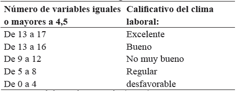 Para medir la comunicación interna se aplicó una encuesta (Elaboración propia) con 15 reactivos. Para medir el clima organizacional se ha considerado 19 variables distribuidas en 5 dimensiones. Ambas encuestas obtuvieron 0,984 de confiabilidad (Alfa de Cronbach). El cuadro siguiente explica mejor la escala del instrumento de clima organizacional: