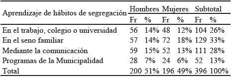 Según la tabla 01, que el aprendizaje de hábitos y acciones de segregación de residuos sólidos se aprenden en el hogar (32%) lo cual indica que la actitud que ponen de manifiesto los pobladores en la ciudad de Puno, depende de la educación familiar y que formar los hábitos de segregación de los residuos sólidos en los miembros de la familia, sobre todo en los hijos, es responsabilidad de los padres. Uno de los hallazgos centrales del estudio es el papel protagónico de la comunicación (28%) pues un importante sector de la población señala que las prácticas y acciones de segregación las aprendió a través de la comunicación. Quienes respaldan esta posición consideran que la comunicación es parte fundamental en la formación de ciudadanos conscientes, puesto que ella transfiere conocimientos, induce y/o motiva cambios. De ello se desprende que, con el uso estrategias comunicativas se puede consolidar hábitos de segregación considerando el poder de penetración que tienen los medios de comunicación. Otro grupo de la población (26%) afirma haber aprendido a realizar la segregación en el trabajo, colegio y/o universidad, en estos espacios también se generan cantidades considerables de residuos sólidos por lo que sus directivos, en cumplimiento de la responsabilidad que les asiste, promueven la segregación de la basura, fomentando de esta manera, los hábitos de separación pertinentes. Finalmente, llama la atención la escasa presencia del Gobierno Local ya que solo un escaso porcentaje de la población (14%) manifestó haber aprendido los hábitos por medio de los programas y/o campañas que realiza la Municipalidad Provincial de Puno. De los resultados se desprende que la familia y la comunicación y, mejor aún, la comunicación en la familia, son los factores clave para promover la asunción de hábitos segregación que incidirán en una mejora sustancial de esta praxis en la comunidad. Las mujeres están mucho más conscientes que los hombres sobre aprender la importancia de la segregación en el seno familiar.