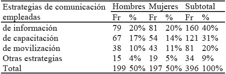 Otro aspecto que se debe destacar está relacionado con las estrategias de comunicación que emplea la Municipalidad casi la mitad de la población (40%) percibe que la estrategia de información es la que más emplea la Municipalidad, lo que convierte a ésta en una herramienta de gran potencial para dar a conocer el programa de segregación de residuos sólidos y, no solamente la difusión de materiales en favor de la segregación, sino un verdadero proceso de movilización informativa para el cambio en los hábitos y la correcta comprensión de la campaña más allá del simple traslado de información. Ésta puede y debe emplearse como un mecanismo para promover la mejora continua de la capacidad para emprender acciones en favor del tratamiento adecuado de residuos. Otro sector de la población (30%) avizora que mediante la estrategia de capacitación se logra promover hábitos y acciones de segregación mediante la adquisición de aprendizajes para el cambio de conductas facilitada por la comunicación interpersonal. Un tercer grupo poblacional (18%) percibe que la estrategia de movilización permitiría mediante la motivación con incentivos, formar hábitos de separación de residuos sólidos. Finalmente, un menor grupo (12%) de la población precisa que existen otras estrategias que pueden emplearse para cumplir con el propósito de fomentar la formación de hábitos. En esta perspectiva, las estrategias de información y capacitación son fundamentales a la hora de encarar el problema de la disposición final de residuos y, principalmente la segregación desde la fuente misma.