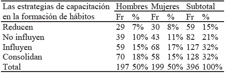 Resulta interesante comprobar que la mayor parte de la población sujeto de investigación (32% + 32%) concuerda en que las estrategias de capacitación empleadas por la municipalidad entre las que se consideran: las charlas, talleres o visitas a hogares, influyen en las acciones de segregación en el hogar consolidándola como hábito desarrollando capacidades y aprendizajes duraderos incidiendo positivamente en las acciones de clasificación de residuos sólidos y en la actitud de la población en ese sentido. Llama la atención que contrariamente un sector de la población (21%) manifiesta que las estrategias no influyen y, más aún que otro grupo, aunque reducido (15%) de la población considera que estas capacitaciones reducen o influyen negativamente en la formación de hábitos de segregación, lo que sólo es explicable desde la inadecuada percepción de las estrategias empleadas. Empero, en términos generales, las estrategias de capacitación son fundamentalmente percibidas como influyentes en la generación de hábitos a nivel de la población puneña.