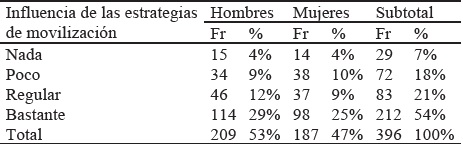 Respecto a la influencia que las estrategias de movilización ejercen en la ciudadanía según a percepción de los integrantes del objeto de estudio, en la tabla N° 5 se puede observar que más de la mitad (54%) de la población asiente que la entrega de incentivos y/o materiales cumple con los propósitos de la movilización dando como consecuencia un aumento significativo de la segregación en el hogar con similar participación de hombres y mueres. Otro sector de la población (21%) consideran que las estrategias de movilización no son tan efectivas ya que, al hacer la calificación de la estrategia la considera regular y que, por tanto, las acciones de segregación se cumplirán de modo que beneficie considerablemente a este objetivo. Adicionalmente, un grupo minoritario de la población (18%) percibe las estrategias de movilización como poco efectivas y que contribuyen escasamente a generar los hábitos de segregación, mientras que otra pequeña parte de la población (7%) descalifica la efectividad de estas estrategias ya que, a pesar de los incentivos otorgados, no se ha podido consolidar los tan esperados hábitos de modo que esa parte de la población continuará con sus prácticas inadecuadas y por tanto seguirá contaminando el medio ambiente. En suma, el 75% de la población entiende que las estrategias de movilización empleadas son eficientes.