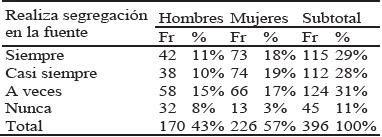 Segregación en la fuente es un sistema implementado por la municipalidad, para el reaprovechamiento de los residuos sólidos desde la fuente de generación, donde la población es el principal actor de su desarrollo, a través de la separación de sus residuos, su almacenamiento y entrega al personal encargado de realizar la recolección. (Minam, 2015). En el seno del hogar, la acción de segregar en la fuente consistente en separar los residuos sólidos, clasificándolos en orgánicos, inorgánicos, reciclables, peligrosos, etc., en la ciudad de Puno, se cumple medianamente, pues entre las categorías siempre y casi siempre totalizan (57%) ante un porcentaje ligeramente superior al (40%) que cumplen la tarea de segregación a veces y nunca. Asimismo, la información evidencia que el trabajo de clasificación de residuos recae mayoritariamente en la mujer, ya que los resultados precisan que, en las categorías: siempre, casi siempre y a veces; la mujer totaliza un (54%) mientras que las sumatoria de las mismas categorías en el caso del hombre que también realiza la terea de segregación en la fuente, llega al (36%). Porcentajes que guardan relación con la asignación de roles en el marco de la sociedad puneña: los hombres tienen la obligación de trabajar, mientras que las mujeres cuidan del hogar. En conclusión, son fundamentalmente, las mujeres las que segregan los residuos sólidos en el hogar por estar más en contacto con los quehaceres del hogar, por corresponderle según el rol social asignado y por conocer mejor el tipo de deshechos que se generan en su hogar.