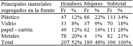 Según la tabla 7, los desechos que más se clasifican a nivel de las familias de Puno es el plástico y el papel, en un (34%) y un (28%) respectivamente; estos porcentajes responden parcialmente a los objetivos del programa de segregación de la Municipalidad de Puno que pretendía que las personas segreguen en la fuente y opten por clasificar los residuos utilizando diferentes contenedores; consolidando el hábito segregar los residuos sólidos por razón y por convencimiento. Al analizar los resultados obtenidos se pueden notar preferencias por clasificar algunos residuos en función del sexo, ya que las mujeres prefieren clasificar plásticos (22%), papel-cartón (16%), y vidrio (9%); mientras que los hombres prefieren separar los metales (20%). Es inferible, por consiguiente, que parte de la población ha logrado formar hábitos de segregación y que la aplicación de las estrategias de capacitación, información y movilización han conseguido, aunque en pequeño porcentaje, que la población preste atención, comprenda, acepte y retenga el mensaje en relación con el tema de la segregación en la fuente.
