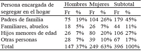 En relación a los integrantes de la familia que se encargan de realizar las acciones de separación de residuos sólidos en la fuente; en primer lugar aparecen los padres de familia con un (45%) y de ese total, el (26%) son las madres de familia que se encargan de la tarea de segregación, este resultado se complementa con la función asumida por las madres de familia en el rol de amas de casa razón por la que se encuentran en mayor contacto con los desechos del hogar y por conocer los hábitos de todos los miembros de la familia en relación a la generación de residuos. Otros miembros de la familia que cumplen la tarea de clasificación son hijos menores de edad con (27 %), y de ellos, nuevamente son las mujeres (20%) las que efectúan esta labor. En otros espacios como señala (Canales- Herrada, C. S. 2013). El grado de mejoramiento de actitudes y desarrollo de capacidades alcanzado por las mujeres recolectoras ha facilitado que se inserten en un eslabón superior de la cadena de valor en la industria del reciclaje, que corresponde a la capacidad de almacenaje que tienen pocos recolectores. Es decir, han pasado de la recolección en el botadero El Milagro en condiciones infrahumanas, a la recolección formal en el distrito de Huanchaco, realizando trabajo decente con el uso de instrumentos de trabajo y mejorando sus condiciones socioeconómicas. En Puno la tarea de segregación no es asumida como consecuencia de la reflexión ni por sus obvias ventajas, es más bien, una tarea poco grata encargada a algún o algunos miembros de la familia como una obligación y como su contribución al hogar. Por tanto, no se podría afirmar que las estrategias de información y capacitación desplegadas por la Municipalidad provincial de Puno, lograron en las personas consolidar el hábito de segregar los residuos sólidos.