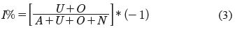 No calculo da porcentagem de clientes insatisfeitos, deve-se somar o número de consumidores cujas respostas à pesquisa se enquadram nas categorias: unidimensional e obrigatório. Após isso, se divide o resultado pelo total de respostas positivas ou neutras ao requisito (respostas que qualificam o requisito como reversos também não são considerados nesta função) e o resultado final é multiplicado por (-1). O sinal negativo atribuído a este coeficiente tem o propósito de enfatizar a influência negativa que a ausência deste requisito exerce na satisfação do consumidor. Assim a Equação 3 é usada para clientes insatisfeitos.