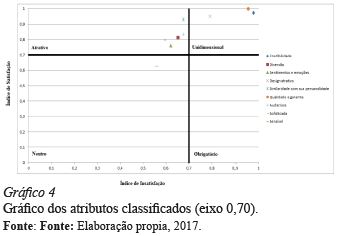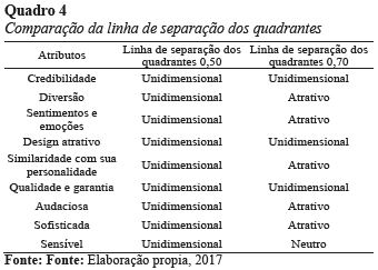 No quadro 4, que compara os Gráficos 3 e 4, com a linha de separação dos quadrantes 0,7 os atributos: diversão, sentimentos e emoções, similaridade com a personalidade do cliente, audaciosa e sofisticada passam a ser atrativos, ou seja, se tiverem alto grau de desempenho trará plena satisfação, porém, não trará insatisfação ao cliente se não for atendido. Já o atributo sensível passa a ser classificado como neutro, não resulta em qualquer satisfação ou insatisfação do cliente. Os atributos: credibilidade, design atrativo e qualidade, continuam sendo unidimensionais, portanto a satisfação do cliente é proporcional ao grau de desempenho e vice versa.