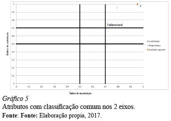 A partir dessa premissa foi utilizado o gráfico 5 como base para a nova classificação. Assim, os atributos em que a pesquisa resultou como unidimensionais para os dois quadrantes (0,50 e 0,70) foram considerados para a nova etapa, utilizando tal metodologia foram selecionados 3 atributos: credibilidade, design atrativo e qualidade e garantia.