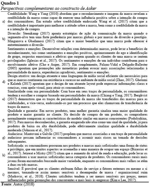 O constructo teórico de construção da identidade de marca estabelecido neste estudo teve como referência a proposição de Aaker (2007), a adaptação de Muniz e Marchetti (2005) e Scharf (2012), bem como o pressuposto de Fournier (1998), que introduz o conceito de amor para identificar interações entre consumidores e marcas. Como reforço aos princípios teóricos que sustentam este estudo, se apresenta o quadro 1 com perspectivas complementares, que são: