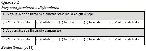 A partir dos questionários faz-se classificação de cada atributo, individualmente para cada respondente, utilizando-se da tabela proposta por Kano para estabelecer a correlação entre as questões do tipo funcionais e disfuncionais. No quadro 2, é aplicado um questionário dividindo cada pergunta em duas situações hipotéticas: Tipo de pergunta Funcional e Não Funcional.