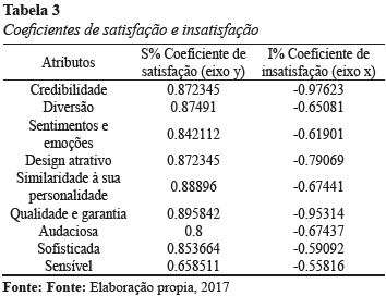 Quando o percentual é significativamente mais elevado, assim como ocorreu com alguns atributos no item "unidimensional", existe uma tendência que essa seja a sua classificação de Kano. A análise dos dados encontra-se representada a seguir através do gráfico de dispersão do índice de satisfação do cliente. A partir dos dados obtidos na tabela 2 foi possível calcular I% e S%. A tabulação dos dados resultou na tabela 3, coeficiente de insatisfação (eixo x) coeficiente de satisfação (eixo y).