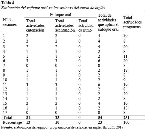 Abstract: Oral approach in the curricular programming of the English course in the educational institutions of full school day, considers the process of dynamic interaction between one or more interlocutors to communicate their ideas and emotions in the classroom from the literacy for the teaching of English; which is an improper procedure. The purpose of the study is to evaluate the application of the oral approach in the curricular programming of the English course. The methodology is of an evaluative descriptive nature in which 17 scheduled learning sessions were analyzed for the 2017 academic period of the first grade of secondary education, to describe the types of activities that include intonation, accentuation and rhythm contents. The result of the evaluation of 231 programmed activities in a 23% is close to develop orality. In conclusion, the application of the oral approach in the curricular programming of the English course in JEC schools, there is little programming of intonation activities, accentuation and rhythm activities are not noticed to promote the orality of the English language.