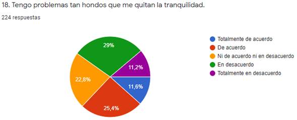 En la figura 3, la respuesta afirmativa a este ítem señala autosuficiencia, calma emocional, apacibilidad o alguna condición que permita conseguir el estado de felicidad, lo que se puede observar en un total de 90 estudiantes (40.1%) que se caracterizan por sentirse personas realizadas que han conseguido las cosas que son importantes en la vida, no obstante, un conjunto de 134 universitarios (59.8%) muestran síntomas de dependencia, subyugación, miedo o estados similares que no les permiten sentir felicidad, hecho que afectará en su performance profesional.