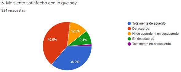 La relación relevante entre la variable felicidad como factor que impacta en el rendimiento académico encontrada por Ravina, Ahumada y Gálvez (2019), se legitima con los porcentajes encontrados en referencia a las ubicaciones de los estudiantes en el ranking académico, pues el 33.0% se ubican en el medio superior, el 35.7% en el tercio superior, el 12.1% en el quinto superior y el 10.7% décimo superior, situación de coincidencia que permite reflexionar sobre el efecto positivo de los sentimientos en la formación profesional. Asimismo, un total del 76.8% de alumnos brinda una respuesta positiva a la afirmación “me siento satisfecho con lo que soy” (véase la figura 2), lo que expresa satisfacción por lo que han logrado y se relaciona con el rendimiento académico aceptable en el proceso de formación académica.