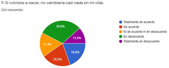 Los resultados del factor “Realización Personal” en referencia al ítem 9 “si volviese a nacer, no cambiaría casi nada en mi vida” (véase figura 3) muestran que los universitarios perciben un nivel promedio de felicidad, lo que concuerda con Hernández y Carranza (2017) que manifiestan que a mayor felicidad mayores niveles de optimismo. Ahora bien, el 59.8% de estudiantes perciben sensaciones de sumisión, sometimiento, miedo o algún otro estado que no les permite sentir felicidad, resultado comparable con lo hallado por Fernández (2017) donde 42% de estudiantes consideran que no han logrado las metas que son importantes para la vida, indicando no tener una felicidad plena, ni haber conseguido autosuficiencia, ni tranquilidad emocional, esta semejanza de datos permite evidenciar los niveles disminuidos de felicidad en los estudiantes de la educación superior.