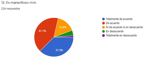 La figura 4, evidencia que 48 estudiantes (21.4%) no sienten lo extraordinario de vivir, puesto que refieren experiencias negativas de la vida y se sienten generalmente mal, ellos necesitan aceptar que la vida está llena de experiencias positivas que pueden contribuir en su existencia, al igual que 176 estudiantes (78.6%) que perciben una vida con cualidades cercanas a la felicidad, ya que se caracterizan por ser personas optimistas que han experimentado la alegría de vivir.