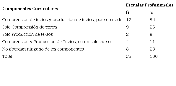 El primer resultado (tabla 1) muestra que en el 77% de las Escuelas Profesionales se desarrollan componentes curriculares de comprensión de textos y/o producción de textos; especificando que en 12 Escuelas se trabajan los dos componentes curriculares en semestres distintos; en 9 Escuelas, solo se trabaja comprensión de textos; en 2 Escuelas, solo se trabaja producción de textos; y en 5, se fusionan ambos en un componente curricular. Esta información permite deducir que los planes de estudio de estas Escuelas fomentan el desarrollo de competencias genéricas, específicamente de la competencia comunicativa. Por otro lado, existen 8 Escuelas Profesionales (23%) que no consideran en sus planes de estudio ningún componente que fomente la educación literaria.