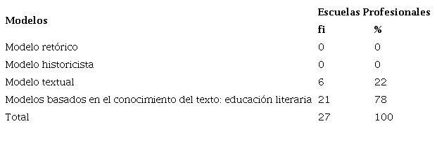 El segundo resultado muestra la delimitación de cuál es el modelo que se utiliza para trabajar la literatura en las aulas universitarias, implícita o explícitamente (Tabla 2).