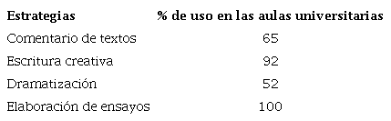 Las estrategias más usadas en la educación literaria en las aulas universitarias son: el comentario de textos, la escritura creativa, la dramatización y la producción de ensayos; todas ellas orientadas a desarrollar procesos de comprensión y producción de textos orales y escritos de manera entretenida y eficaz.